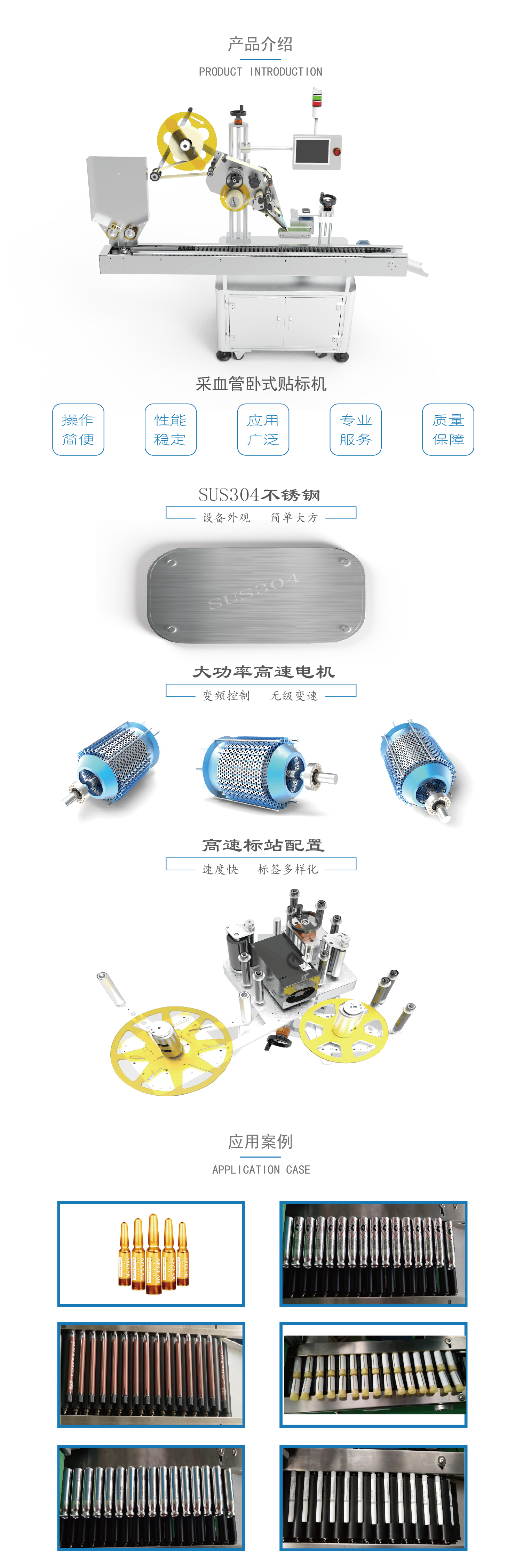 适用以下行业产品的全周或者半周的自动化贴标要求:制药行业类,如安瓿瓶、口服液、采血管等产品;文具用品类,如笔杆、固体胶、浆糊笔等产品;化妆品行业类,如口红、眉笔等产品;肉制品行业类,如火腿肠等圆形产品。 可选用工业视觉检测物体的标签是否有漏贴,对贴标物体的收集、打印三期等功能满足; 本机型主要的材质为符合国际标准的SUS304不锈钢和进口铝合金材质,铝合金的表面经过双层阳极氧化处理,不生锈、不变形。